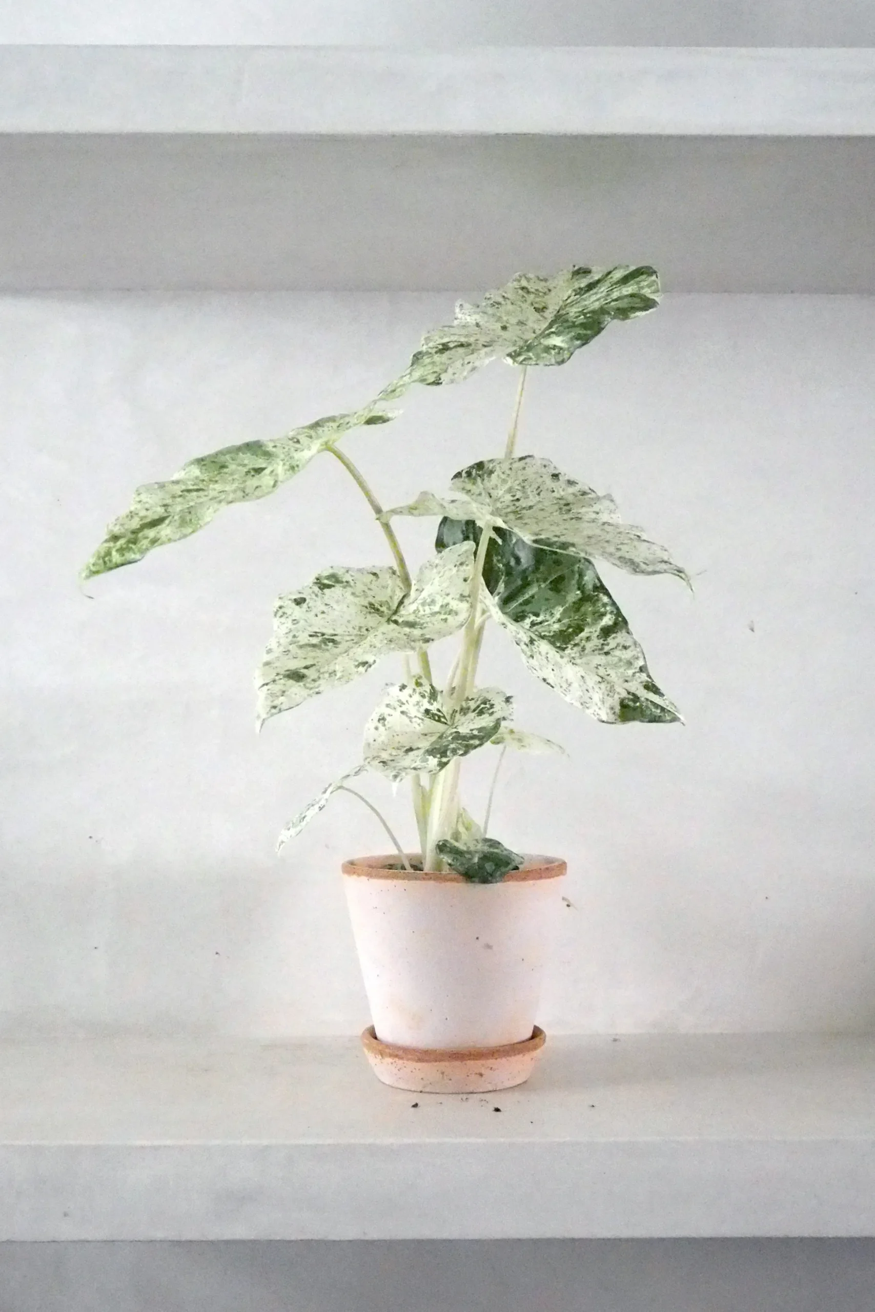 Andet godt tip: Alocasia ‘Camouflage’ sætter pris på høj luftfugtighed. Forstøv bladene jævnligt eller placer planten tæt på andre grønne planter for et mere tropisk mikroklima.