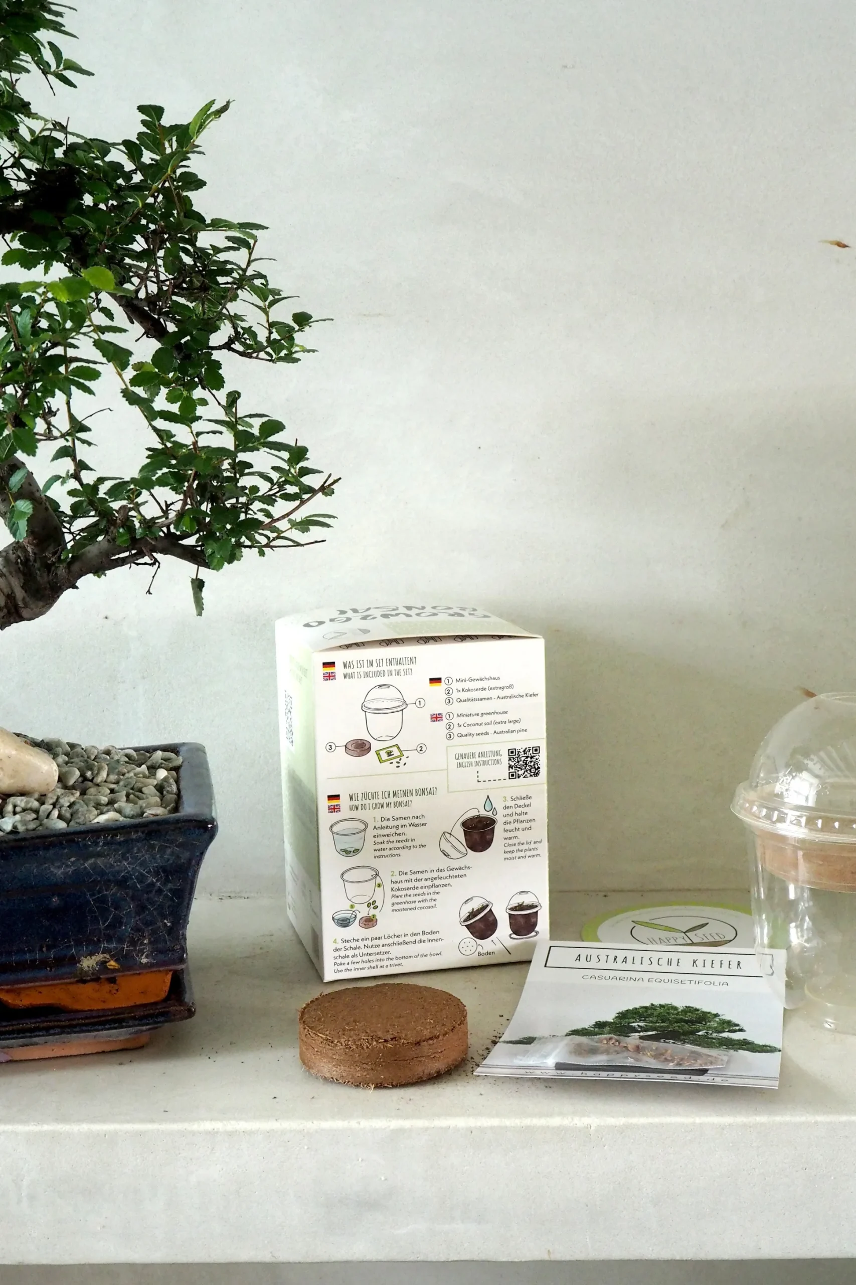 Sættet indeholder frø fra Australsk fyr, en smuk nåletræsart, der er kendt for sit elegante, let buede vækstmønster og sin rolige, grønne farve. Den er ideel til begyndere, da den både er robust og forholdsvis nem at forme som bonsai.