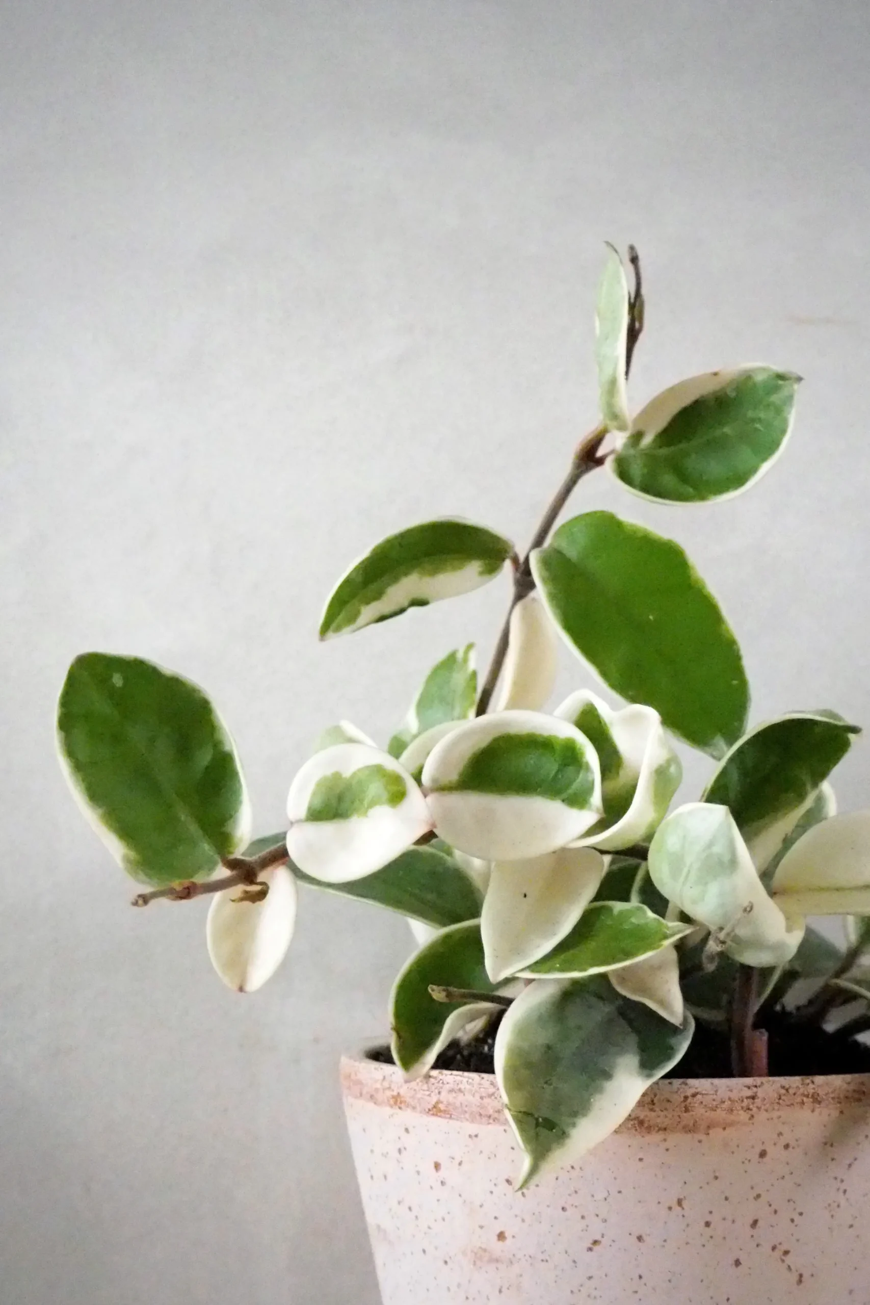 En klassisk og meget populær voksblomst – Hoya carnosa ‘Krimson Queen’ har fine blanke, grønne blade med cremehvide eller lyserøde kanter. De brogede blade giver et frisk og livligt udtryk, og under de rette forhold kan planten blomstre med smukke klaser af stjerneformede, duftende blomster.