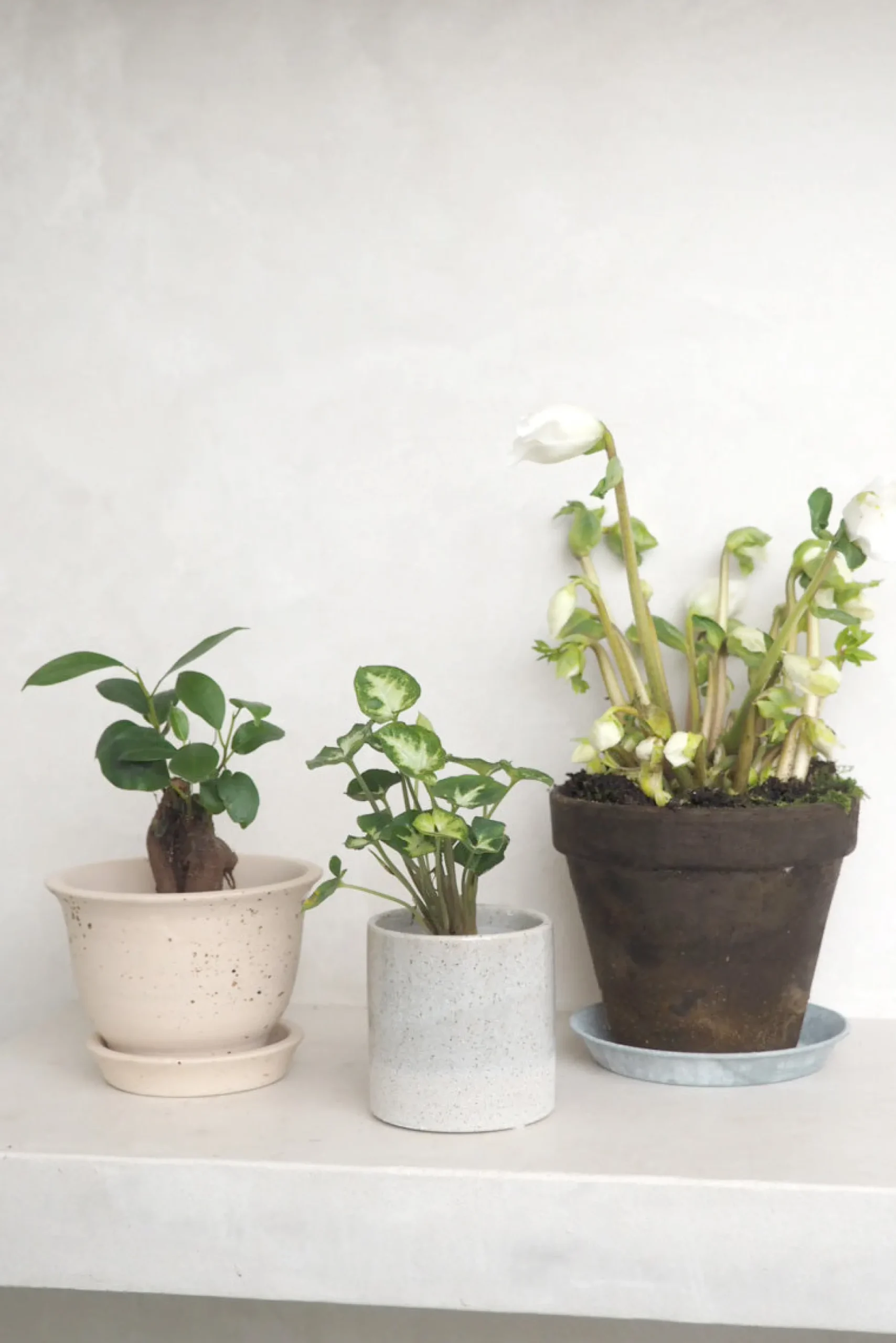 Bemærk at planten kommer i en plastkrukke. Gartnerkrukke kan tilkøbes til planten og på billedet ses den med en underskål Zink ø 12 cm