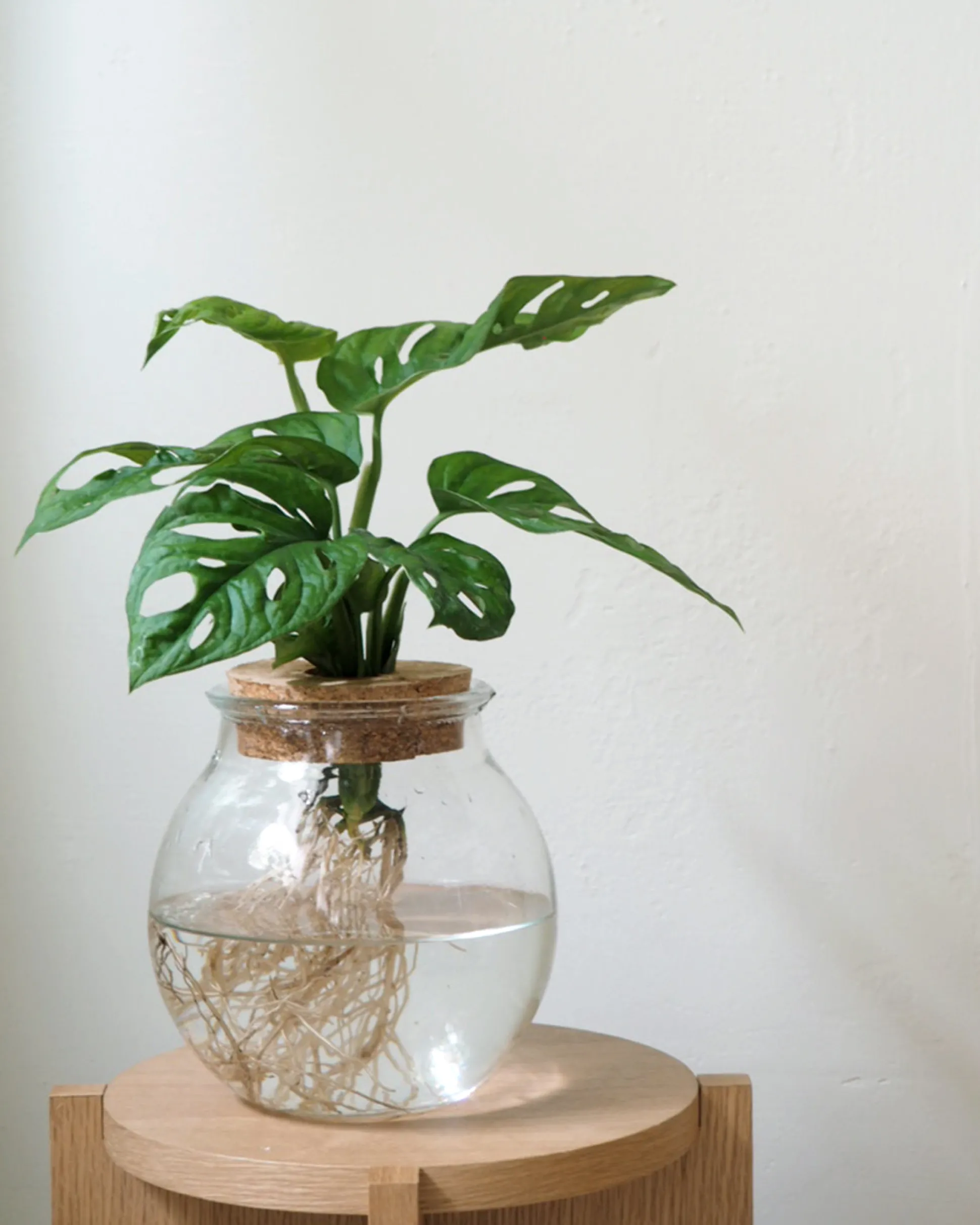 Planters rødder kan være enormt dekorative, og derfor er vi også vilde med planter, der vokser i vand. Monstera adansonii er en smuk tropisk plante, som sagtens kan vokse i vand. Glaskolben kommer med korklåg, som giver planten ekstra støtte og holder den på plads i vasen.