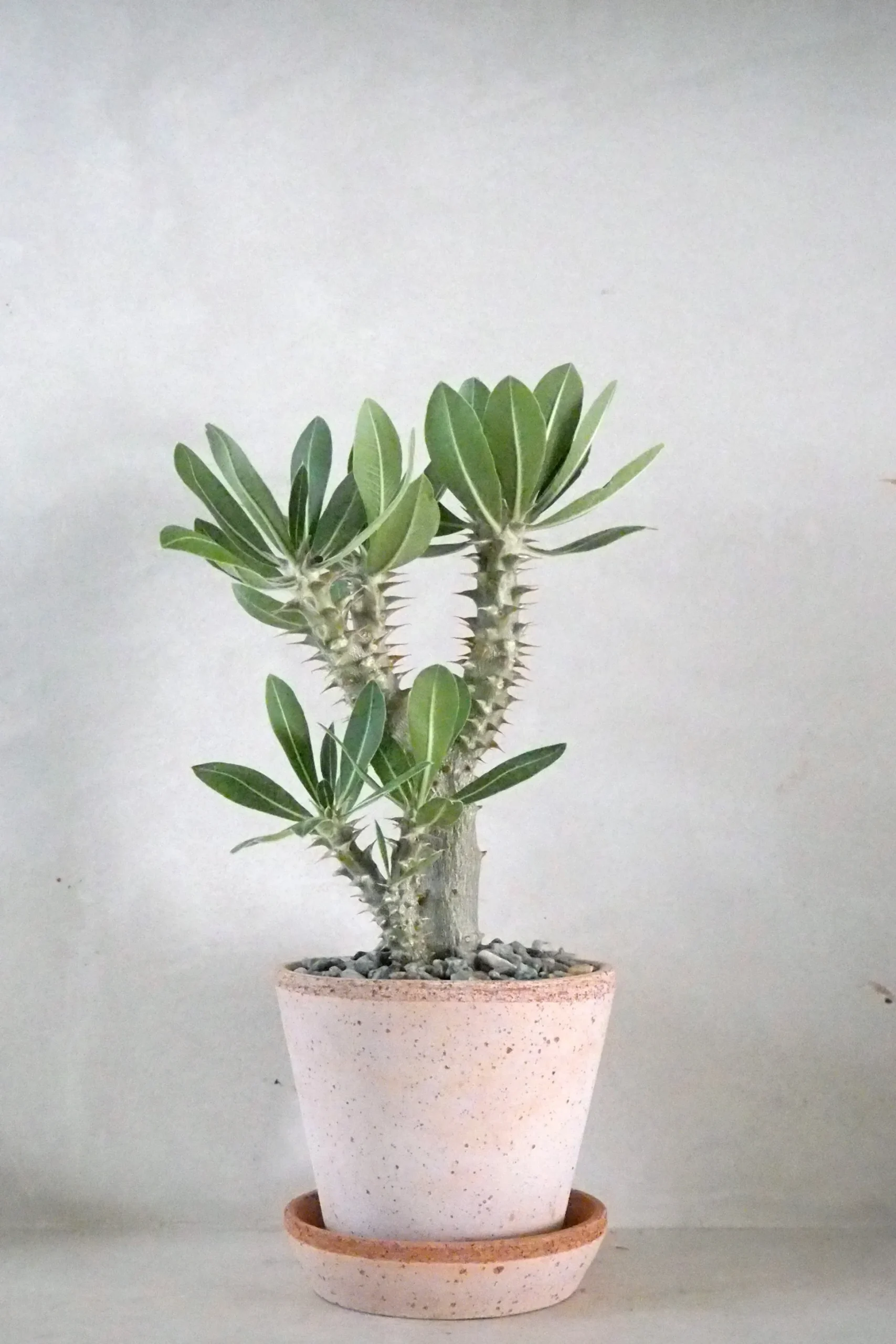 En spektakulær sukkulent fra det sydlige Madagaskar – Pachypodium horombense imponerer med sin kraftige, opsvulmede stamme, der fungerer som vandlager, og sine lange, smalle, grønne blade, der danner en krone i toppen. I blomstringssæsonen kan den pryde sig med store, gule, tragtformede blomster, der står i flot kontrast til den robuste stamme.