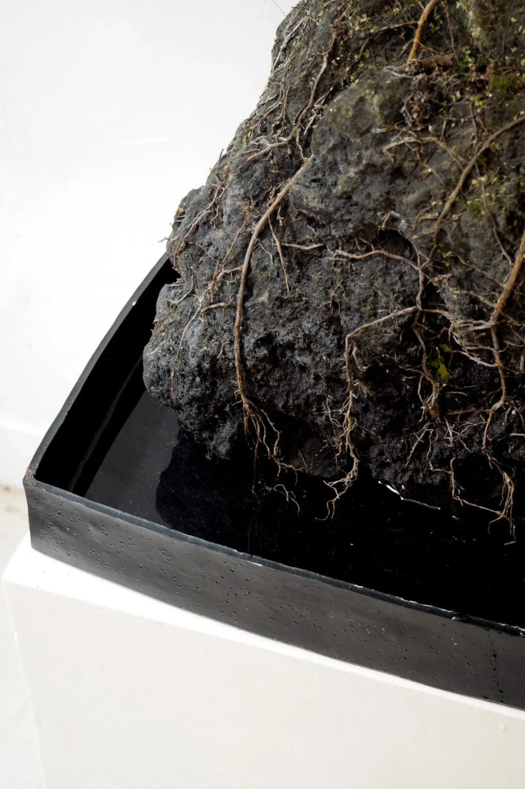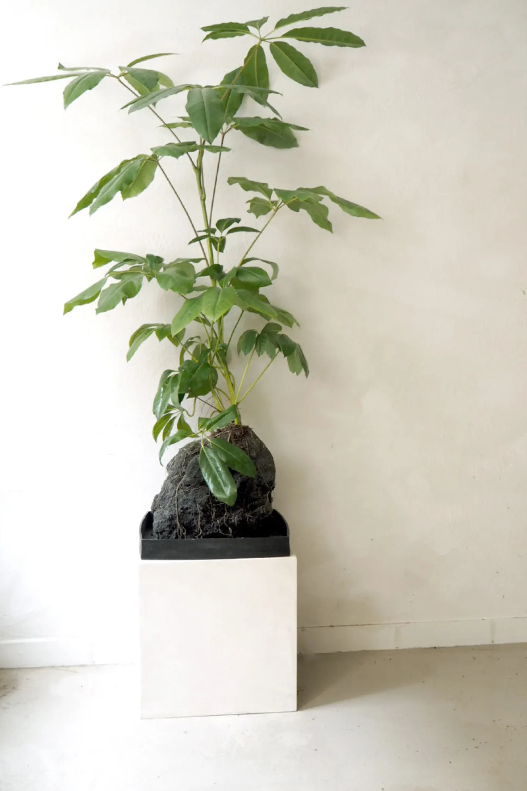 Stor schefflera på lava. Smuk schefflera plante der har slået sine rødder på lavasten. Lavastenen er tilkoblet en lille vandingsbakke, så lavastenen let kan suge vand derfra og få masser af næring fra stenen.