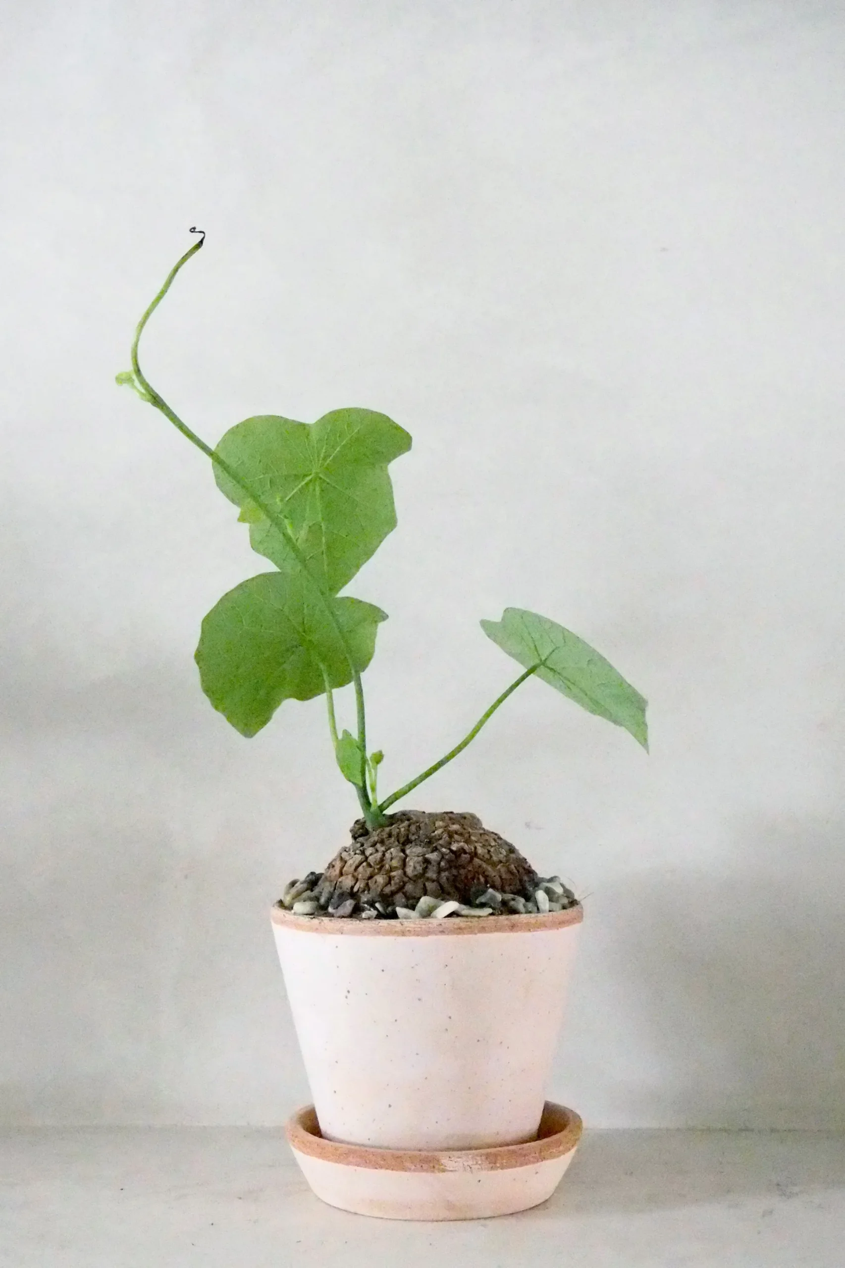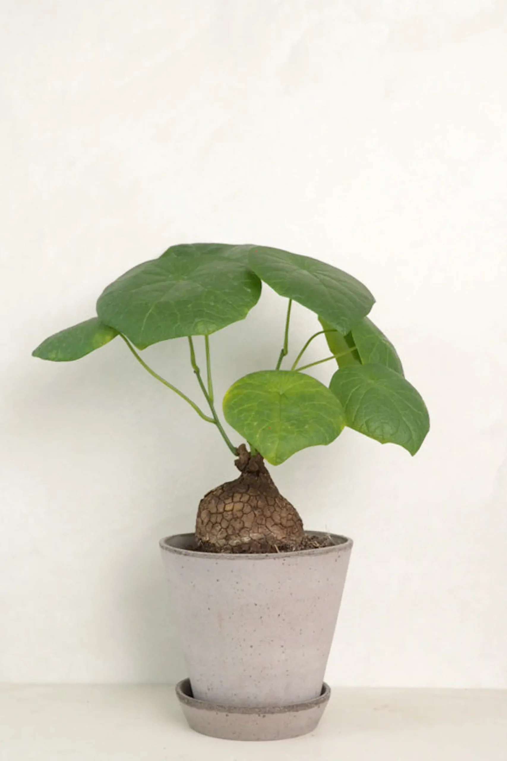 Andet godt tip: Stephania suberosa vokser ud fra sin karakteristiske knold, som gerne må stå halvt over jorden. Vær tålmodig – den kan tage tid om at bryde ud af sin hvile, men belønner dig med smukke, elegante ranker.