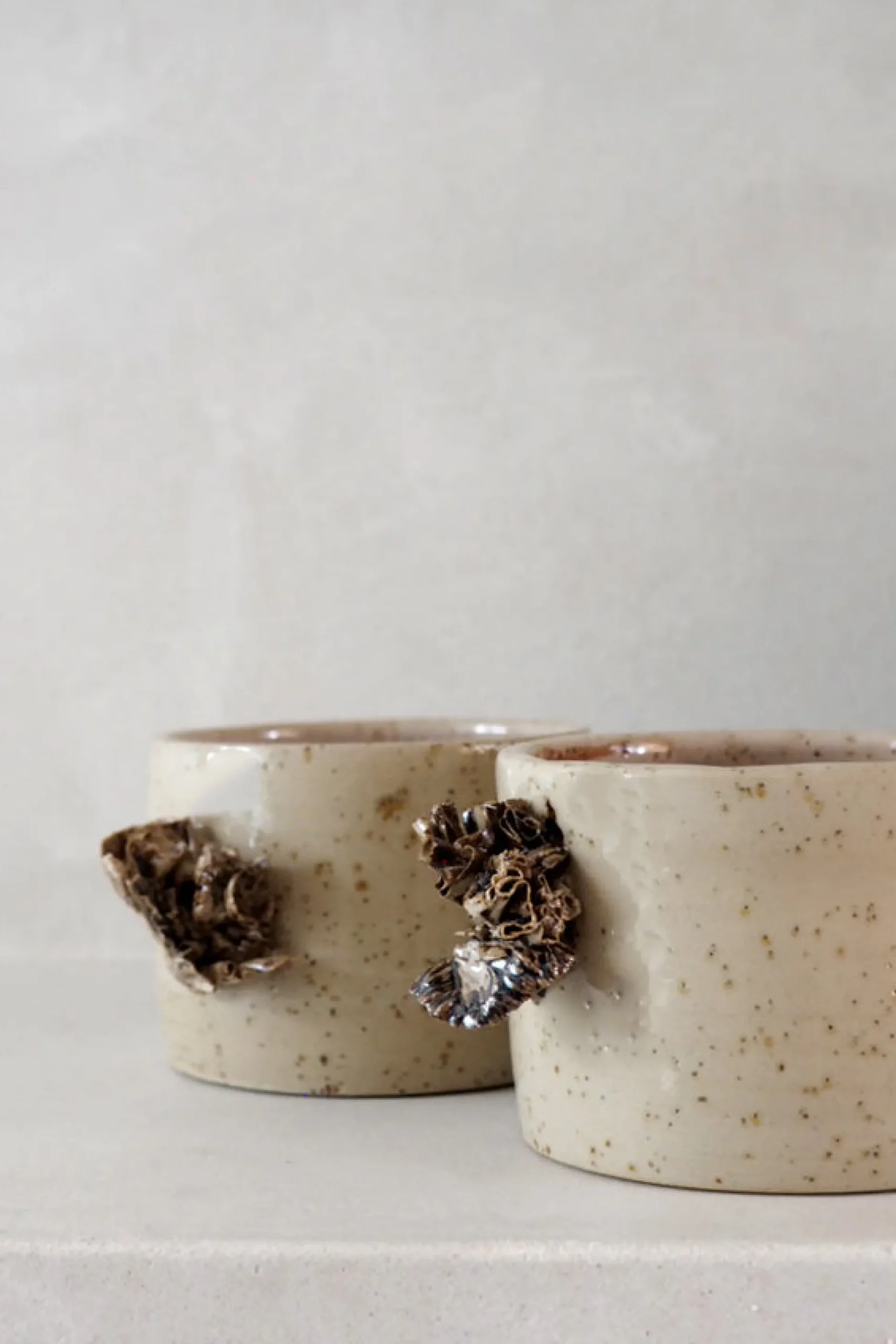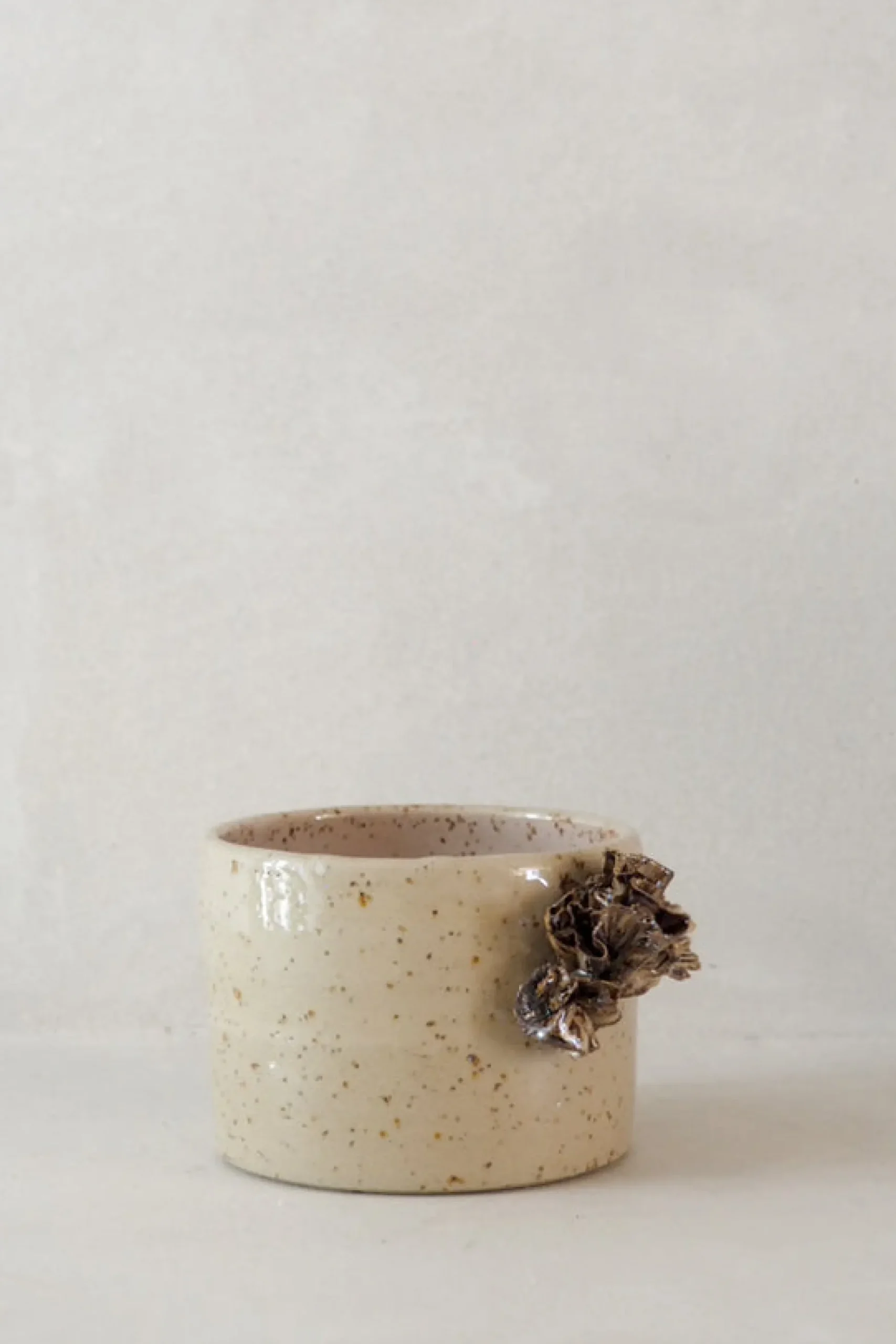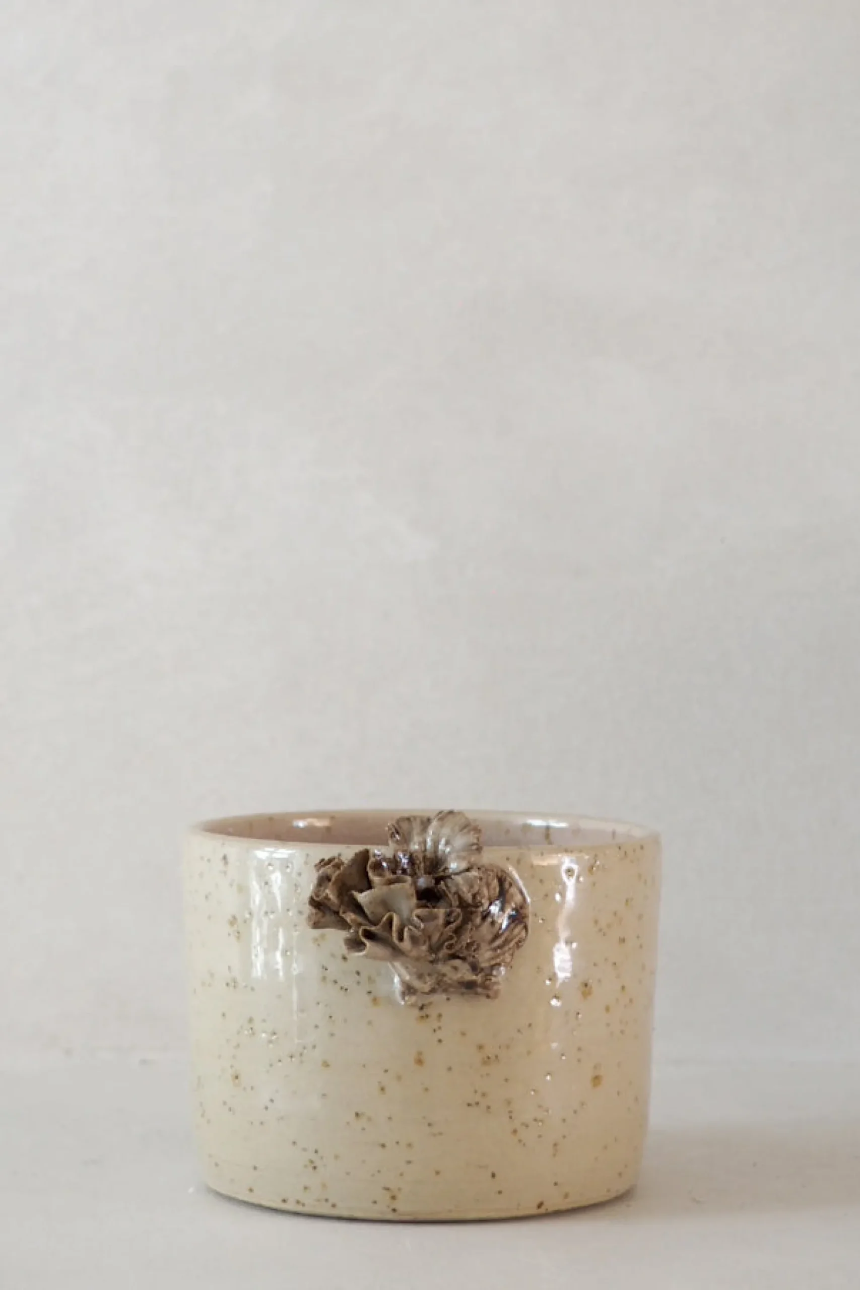 Denne sandfarvede kop er glaseret med gennemsigtig glasur så lavastenene i leret bliver tydelige og giver koppen karakter. Fin keramisk detalje inspireret af tang