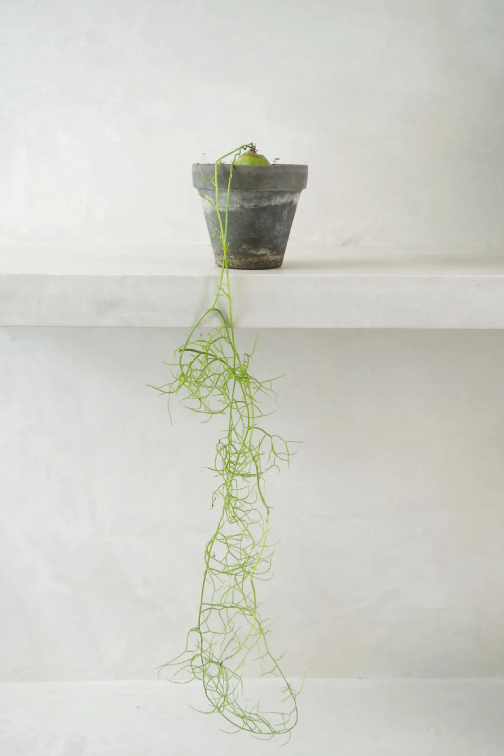 Bowiea volubilis, også kaldet “klatrende løg”, er en usædvanlig og fascinerende plante. Den består af en stor, grøn løgformet base, hvorfra tynde, slyngende skud vokser op som et luftigt net. Den er dekorativ, let og næsten skulpturel. – perfekt til dig, der elsker planter med et anderledes udtryk.