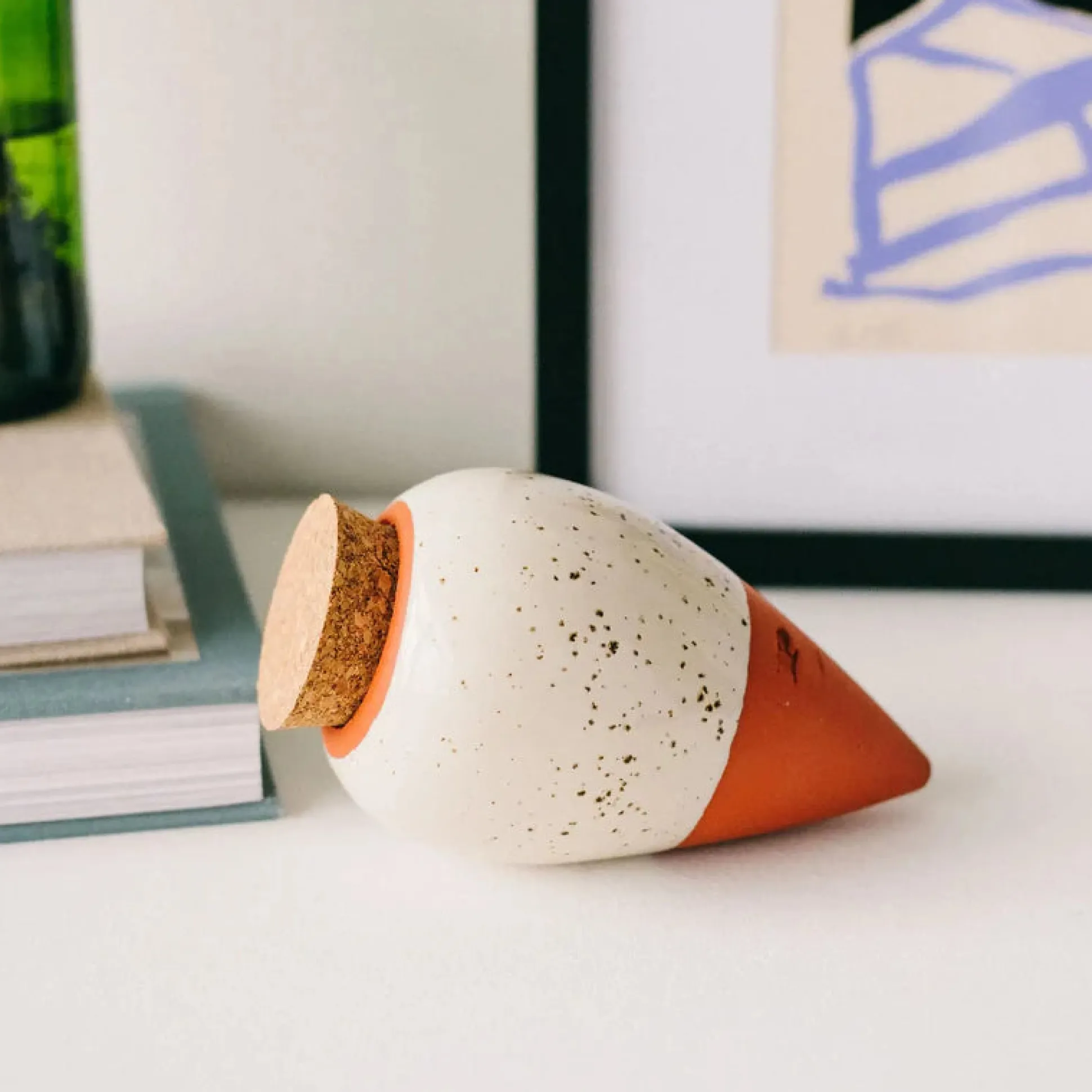 Selvvandingskuglerne er håndlavet i ler med en glaseret top med et lille korklåg, og fås i 3 forskellige farver.
