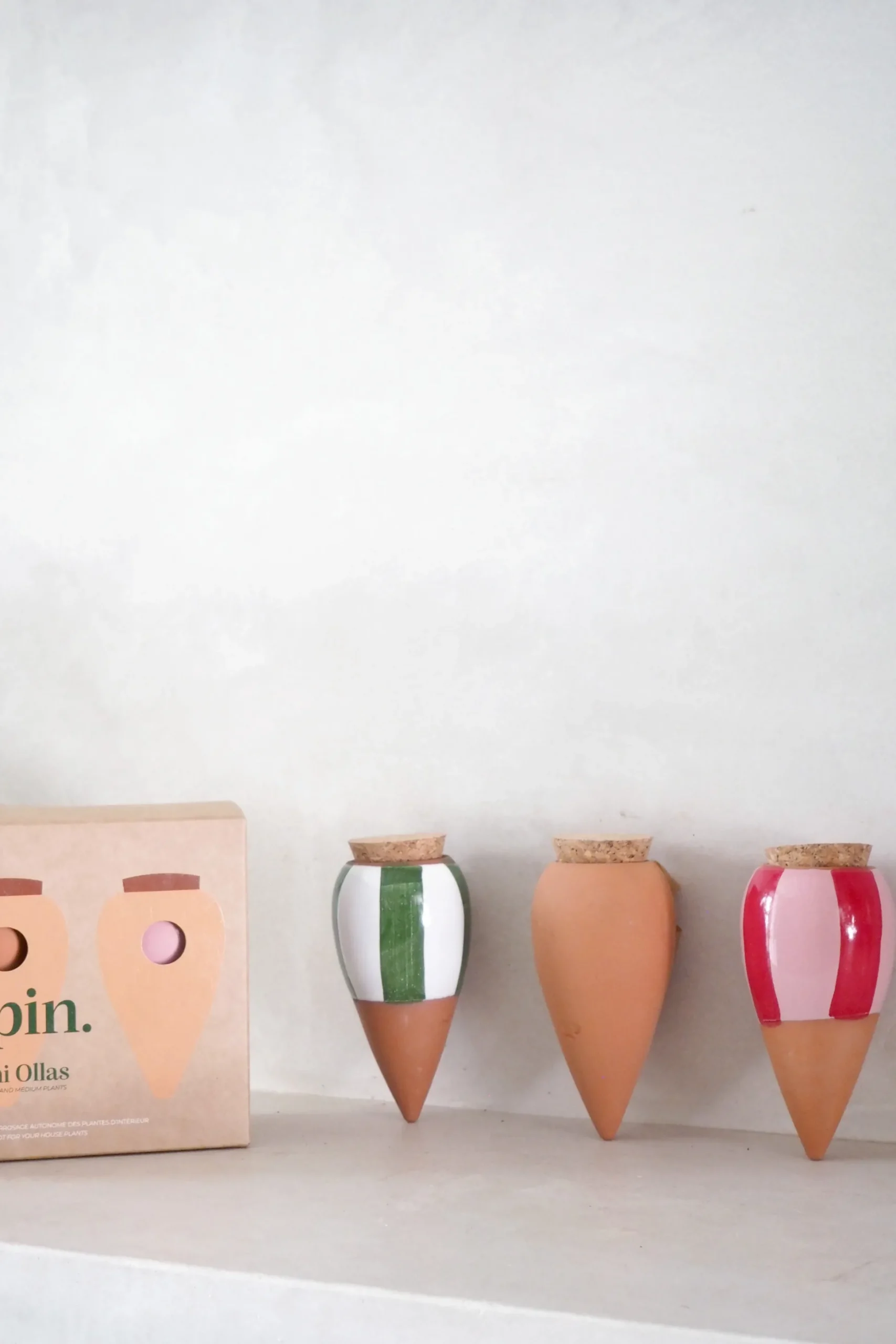 Dette sæt inkluderer tre ollas: 1 x terracotta, 1 x grøn/hvide striber, 1 x rød/pink striber.