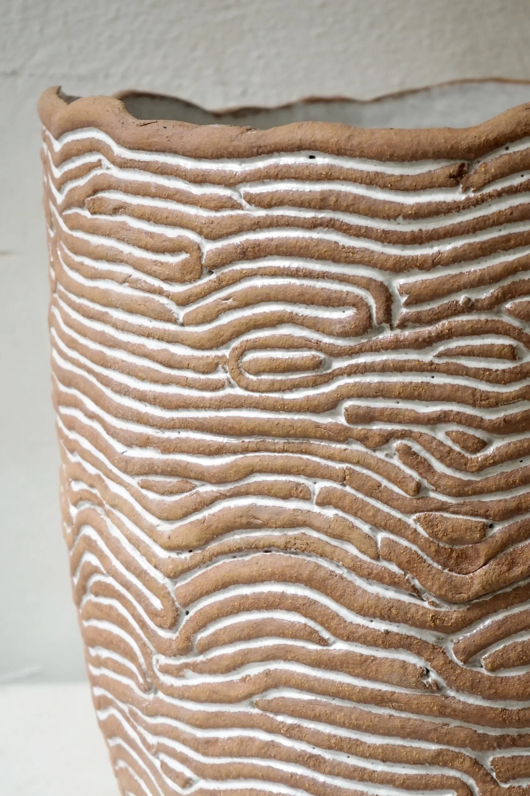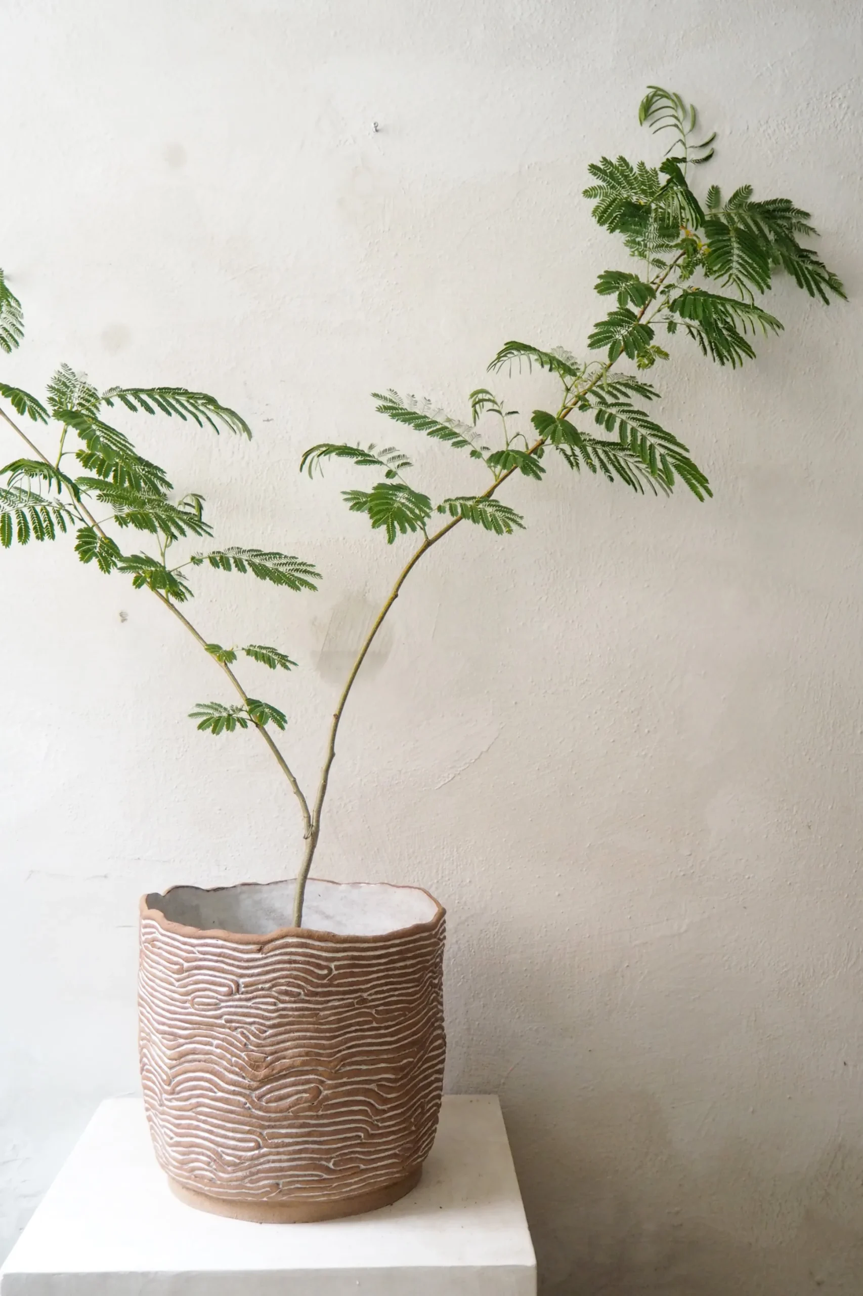 Wood er en serie af håndlavede oversize krukker. Med inspiration i træets stamme og årer har keramiker Stine Mei skabt en række smukke og sanselige krukker i fem forskellige farver og former. Wood krukken er velegnet til store planter og små træer til gulvet. Krukkerne kan variere en smule i form og størrelse, da de er håndlavede.
